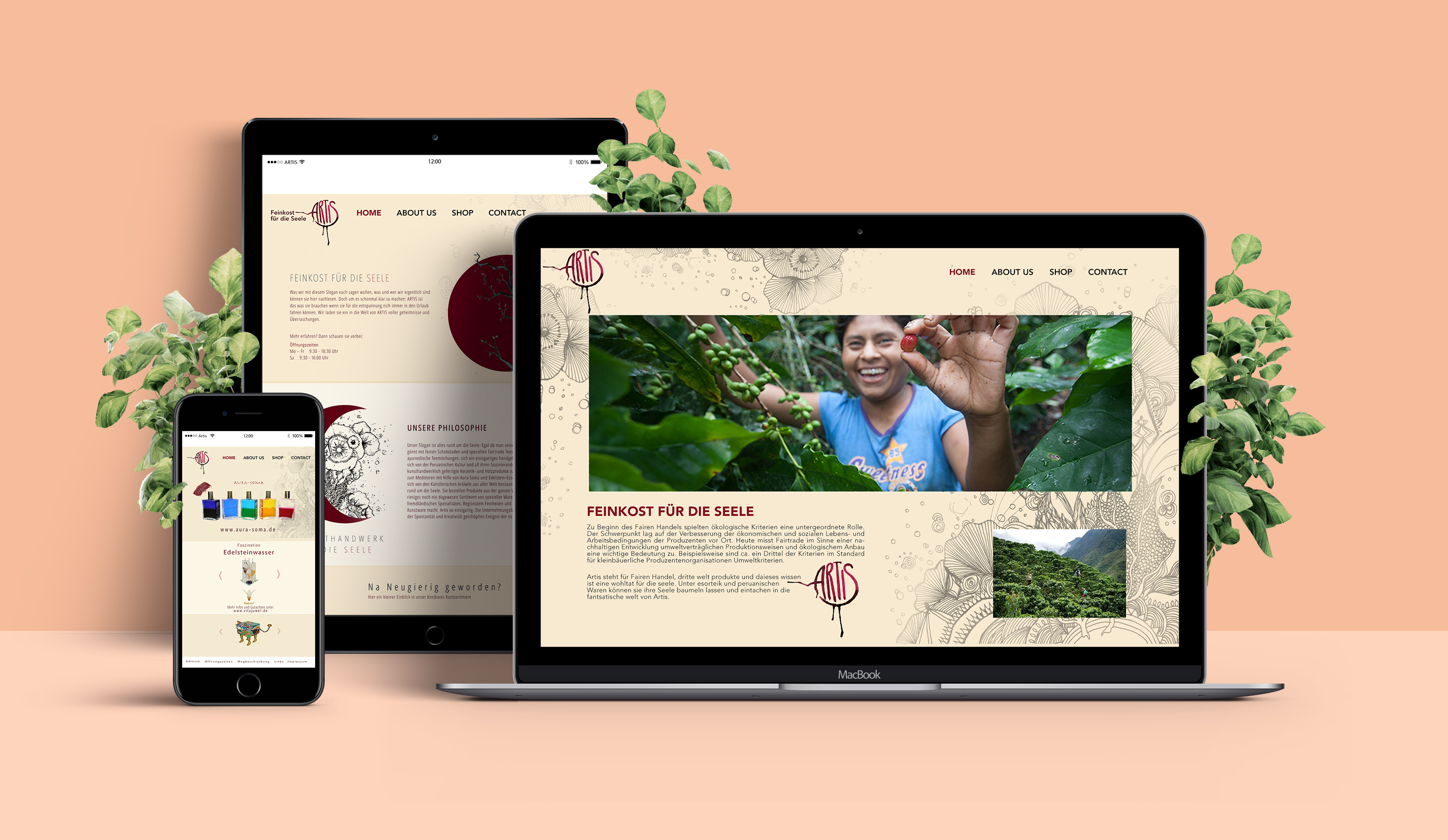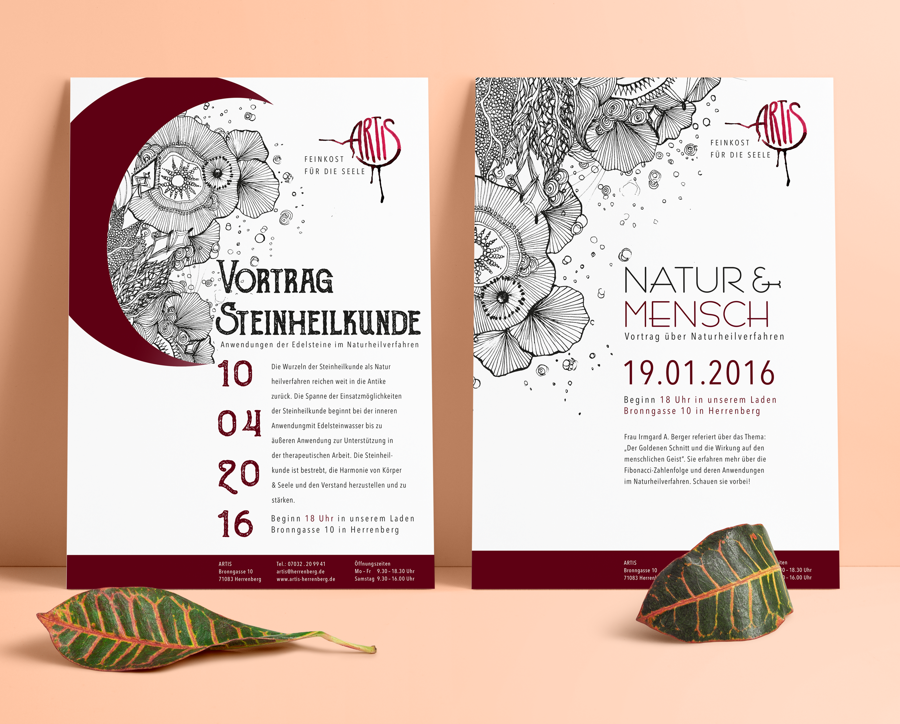 The subslogan of the shop is: Delicatessen for the soul. This is to point out the finely selected articles with a good conscience. The shop and the concoction is very individual and difficult for the consumer to understand. That’s why I chose a delicate and handmade illustration to show the core and the good soul of the shop in an abstract way. The colour warm burgundy red as the house colour stands for the warmth of the soul and the security the shop conveys.